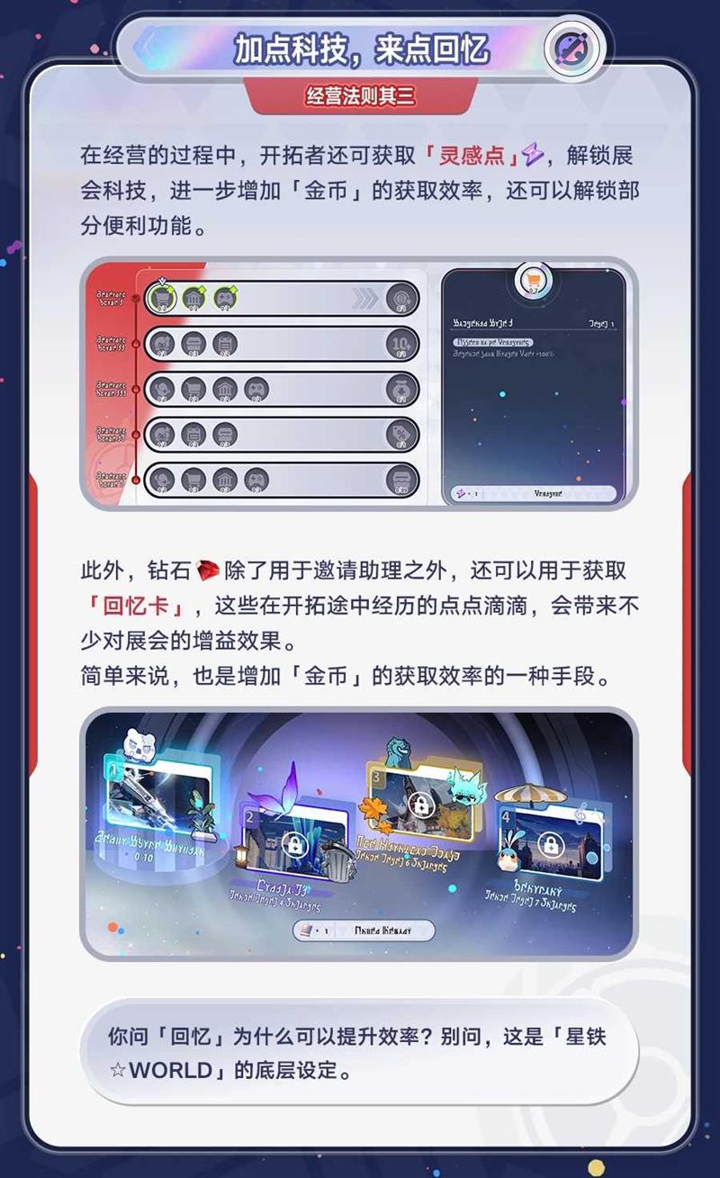 经营过程中会获得「灵感点」,用于解锁展会科技。科技不仅能提升金币获取效率,还能解锁便利功能。钻石还可用于获取「回忆卡」,这些卡片通过记录开拓途中的点滴,为展会提供增益效果。