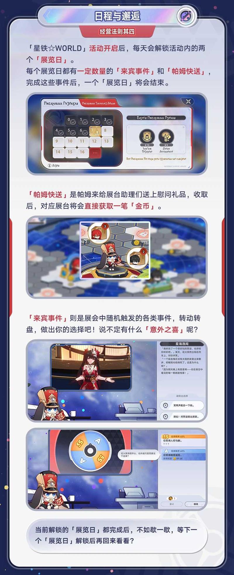 活动每天解锁两个展览日,每个展览日包含「来宾事件」和「帕姆快送」。「帕姆快送」会直接为展台提供一笔金币,而「来宾事件」则通过随机触发的转盘选择,可能带来意外之喜。