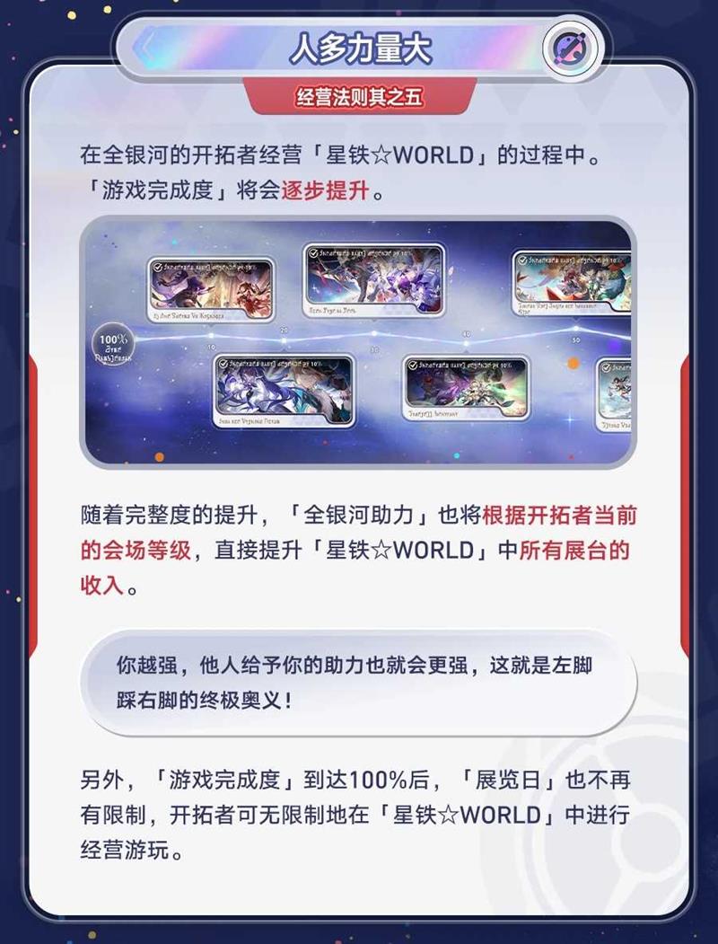 随着全银河的开拓者共同经营,「游戏完成度」将逐步提升。完成度越高,「全银河助力」对会场收入的加成也越大。当完成度达到100%后,展览日的限制将被解除,开拓者可无限制地经营展会。