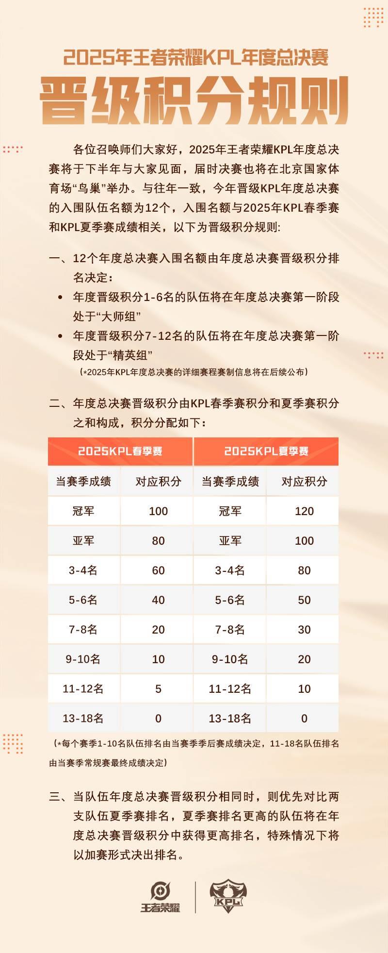 2025年王者荣耀KPL年度总决赛将于下半年与大家见面,届时决赛也将在北京国家体育场“鸟巢”举办。官方正式公布了本年度的赛事晋级积分规则,我们一起来看一看吧。