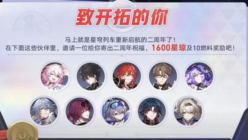 4月26日12:00至5月21日6:00期间,开拓者进入“致开拓的你”活动页面,将会收到受邀请角色的来信,点击领取按钮获得附赠的星琼1600与燃料10奖励。如果在4月26日12:00前未邀请角色,将随机收到一名可邀请角色的来信。活动结束后,将无法收到角色来信并领取奖励。