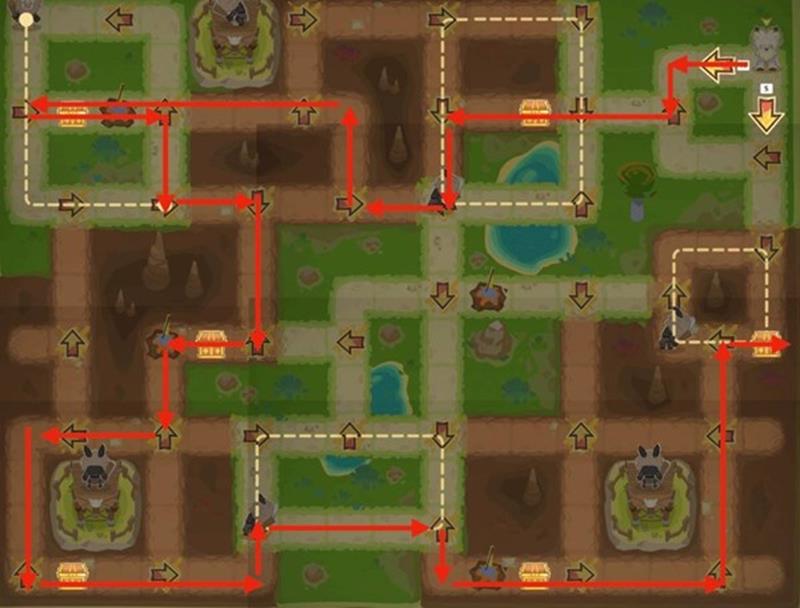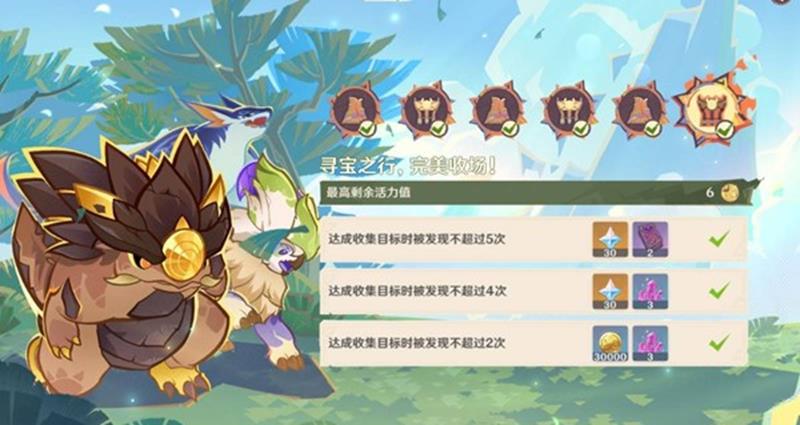 在第六关中,旅行者需要操控小龙收集地图上的颗粒果宝物,同时避免被丘丘人发现超过规定的次数。本关的挑战目标是达成收集目标时被发现不超过5/4/2次。关卡中设置了宝物箱、巡回丘丘人、哨塔以及藏匿点等多种元素。宝物箱是被丘丘人占据的颗粒果宝物的藏身之处,而巡回丘丘人会沿着固定路线来回巡逻,旅行者需要小心避免进入它们的视野。哨塔上的敌人会周期性改变警戒方向,一旦小龙进入其警戒区域就会被发现,因此旅行者需要谨慎规划行动路线进行规避。藏匿点则是小龙躲避丘丘人的绝佳位置,经过并激活后,如果小龙不小心被丘丘人发现,就可以回到藏匿点重新行动。