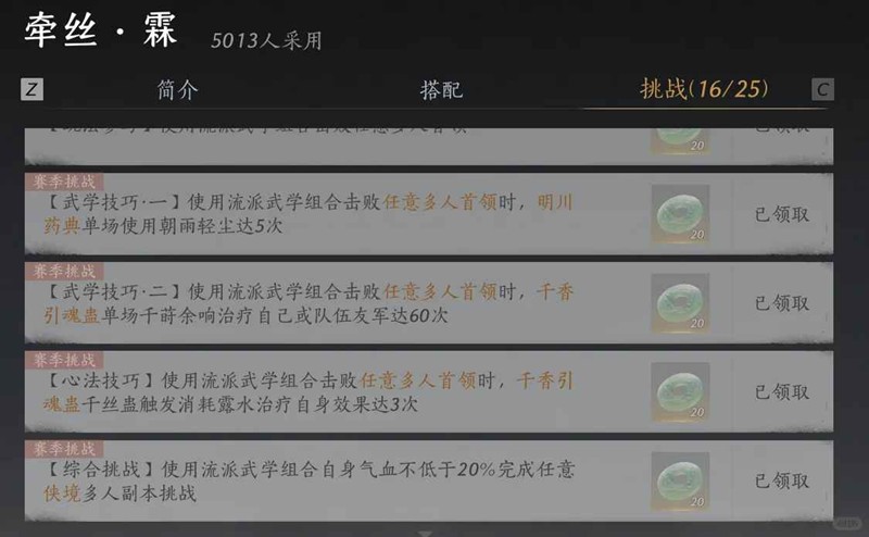 3. 伞特殊技一直挂着,切扇子消耗露水。需要携带心法千丝蛊,这个任务不好完成的话可以主动接一些boss的伤害,但注意别把自己血条玩没。