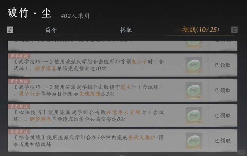1. 伞武学技完美接伞*10,注意技能放出后,按键亮光出现时再点按即是完美接伞,会有特殊音响提醒。