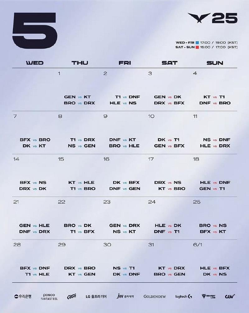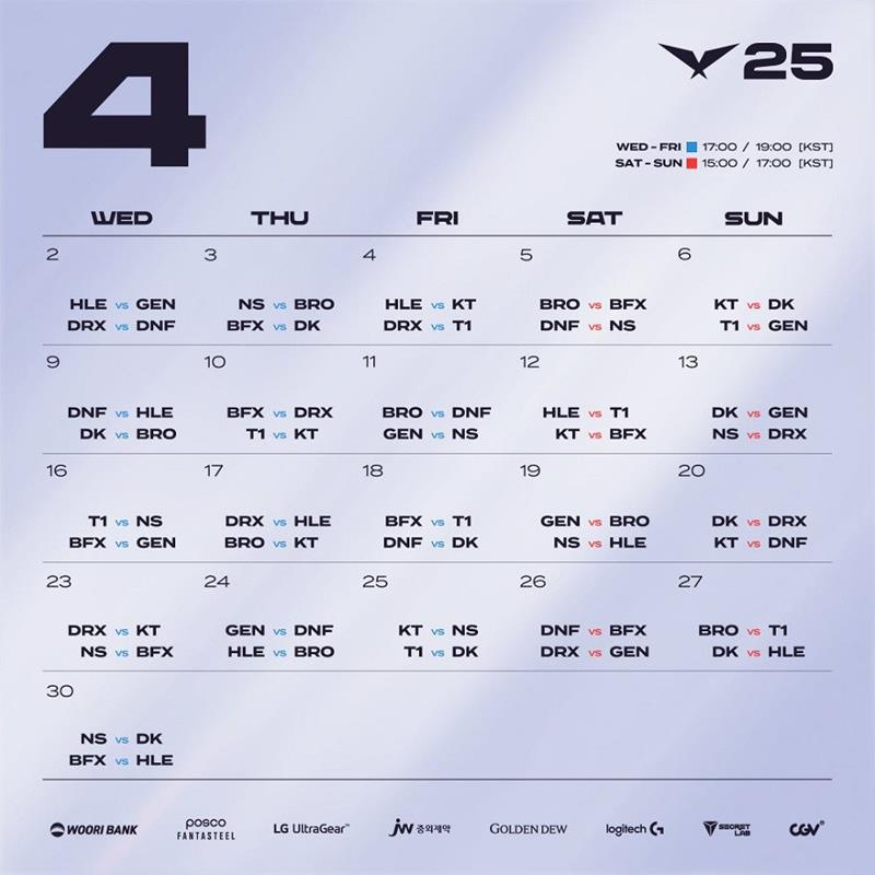 LCK 2025第二轮赛程从4月2日持续至5月18日,采用双循环BO3赛制,10支队伍两两交锋。每周5个比赛日,工作日17:00开赛,周末15:00开赛,前六名将晋级通往MSI之路的资格赛。资格赛在6月7日至9日进行,采用单败淘汰赛制,前两名直接保送MSI胜者组,后四名通过冒泡赛争夺最后一个晋级名额。