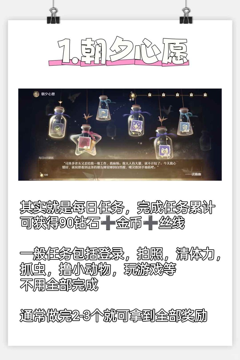 前三个每日必必必必必做:朝夕心愿(每天90钻)、美鸭梨挖掘、体力清理,非常重要,且五分钟就可以轻松搞定。