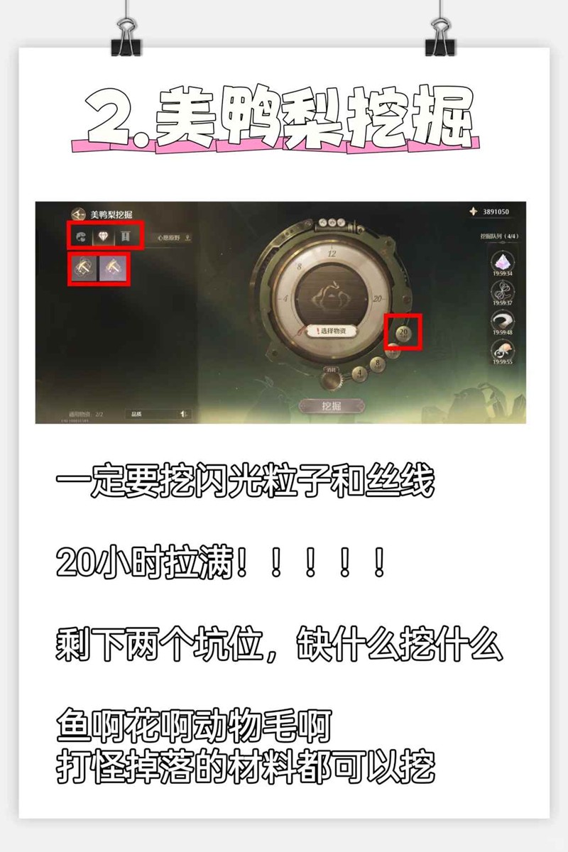 美鸭梨挖掘一定要利用起来!非常省事!除了固定每天挖闪光粒子和丝线,可以挖较难采集的材料或者怪物掉落材料(例如花球娘、心碎补丁、缠绕丝带、凶猛纱布、振翅布块等)