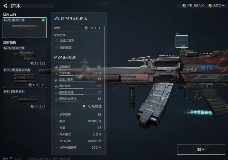 M249轻机枪在裸枪状态下虽然射速快、伤害高,但后坐力和操控速度需要大幅提升。本期改装的核心是M249犀牛长枪管,相比海湾短枪管,它不仅便宜,还能显著增加后坐力控制。虽然会降低操控速度,但可以通过精校和其他配件来代偿。精校时需要减少长度,以加快开镜速度。沙暴垂直补偿器是唯一的紫色配件,能有效改善M249垂直方向的射击体验。M249导轨护木性价比极高,价格远比军规导轨护木便宜,且能增加操控速度。VFG骑士握把能进一步提升操控速度,且只需一个糖三角即可在军需处兑换,相比交易行购买能节省不少成本。
