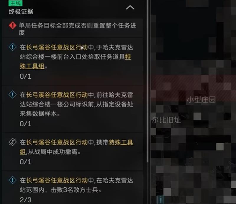进入雷达站后,特种兵需要先找到并击败三名 AI 敌人,这是任务的第一步。接着前往雷达站综合楼一楼前台,在前台桌子上可以找到任务道具“特殊工具组”。拾取它之后,前往综合楼一楼前台往前穿过小门,在哈夫克 LOGO 前进行调查。最后携带“特殊工具组”撤离,需要注意的是,整个任务过程中特种兵必须一命通关,一旦死亡,任务就会失败。