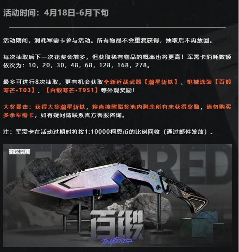 百锻主题军需是暗区突围近期推出的重要内容,其中包含多种稀有物品,如近战武器瀚星斩铁和枪械涂装百锻寒芒系列。
