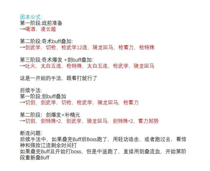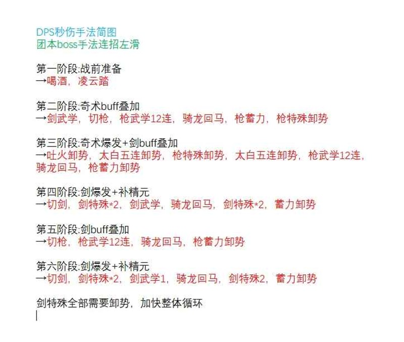 第四阶段:剑爆发 + 补精元,切剑,剑特殊*2,剑武学,骑龙回马,剑特殊*2,蓄力卸势(Buff:五层流血)[剑特殊和武学必须用卸势]
