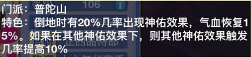 倒地时有20%几率出现神佑效果,气血恢复15%。如果在其他神佑效果下,则其他神佑效果触发几率提高10%。