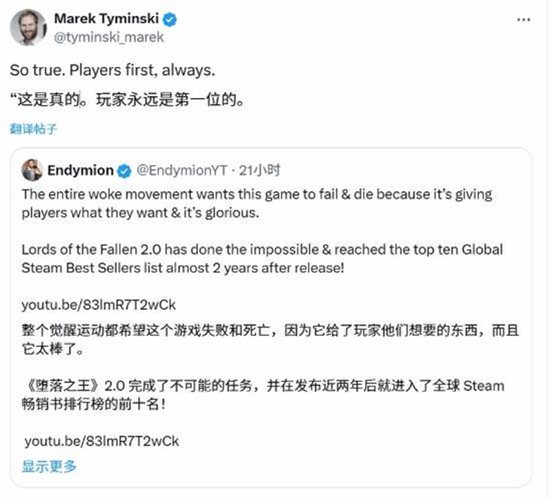 这一罕见的“回春”现象引发了社区的广泛讨论。博主Endymion在社交平台上发表评论称:“整个‘觉醒运动’都希望这款游戏失败并消亡,因为它给予了玩家他们想要的东西。《堕落之主2.0》做到了不可能的事情,在发布近两年后进入了Steam全球畅销榜前十!”