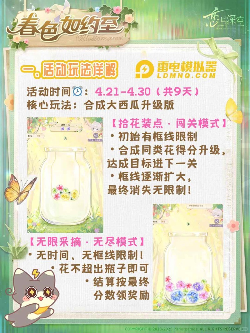 恋与深空「春色如约至」将于 4月21日-4月30日 限时开放,共持续9天!本次活动采用经典“合成大西瓜”玩法升级版,分为闯关与无限两种模式,玩家通过合成花朵得分即可免费兑换 1000钻石、服装自选礼盒、养成材料等丰厚奖励。那么春色如约至免费肝活怎么玩?小编为你准备了一份攻略,一起来看看吧~