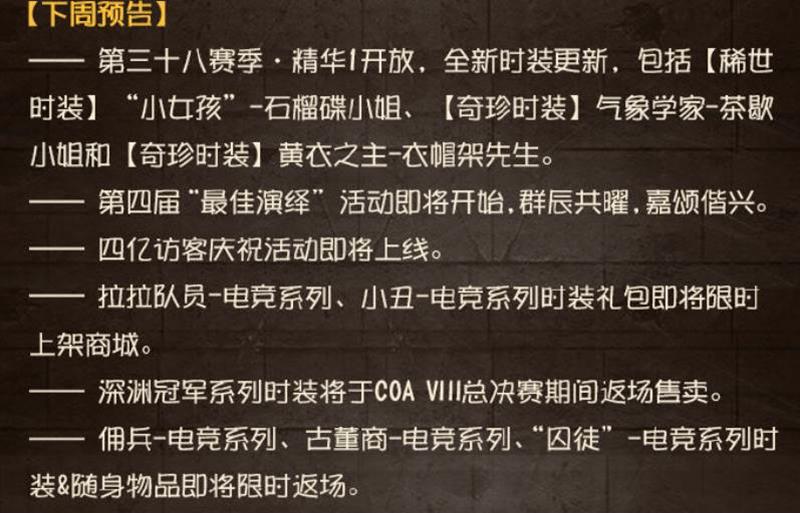 第三十八赛季·精华1开放,全新时装更新,包括【稀世时装】“小女孩”-石榴碟小姐、【奇珍时装】气象学家-茶歇小姐和【奇珍时装】黄衣之主-衣帽架先生。第四届“最佳演绎”活动即将开始,群辰共曜,嘉颂偕兴。四亿访客庆祝活动即将上线。