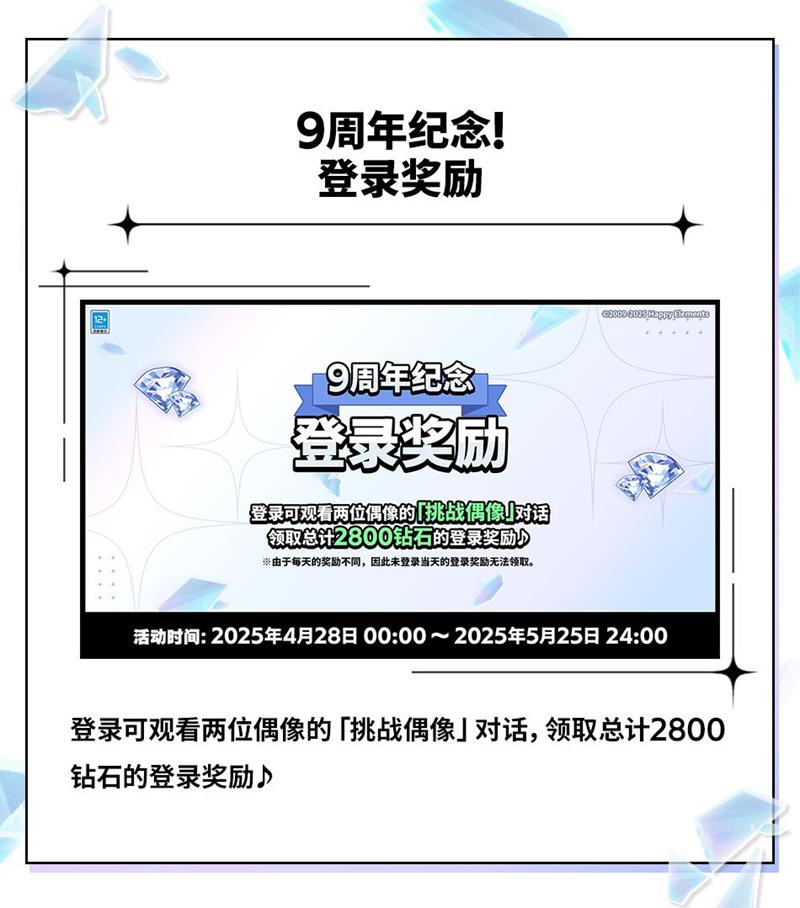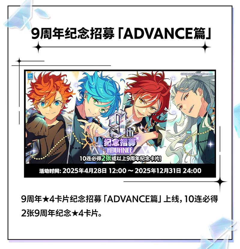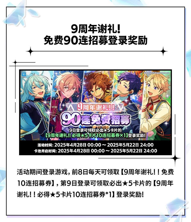 在本次9周年庆典中,《偶像梦幻祭2》为玩家准备了丰富多样的活动内容。活动期间,玩家最高可获得【9周年谢礼!10连招募券×8】【9周年谢礼!必得★5卡片10连招募券×1】【钻石×5550】等珍贵道具。除此之外,还有“周年纪念挑战”MV服装(全员)、“周年纪念挑战”房间服装(全员)、限定语音×14等丰富福利,以及【绝对能找到“我推”的房间活动卡片★5紫之创】和【“我推”卡片×1】等也将送出。