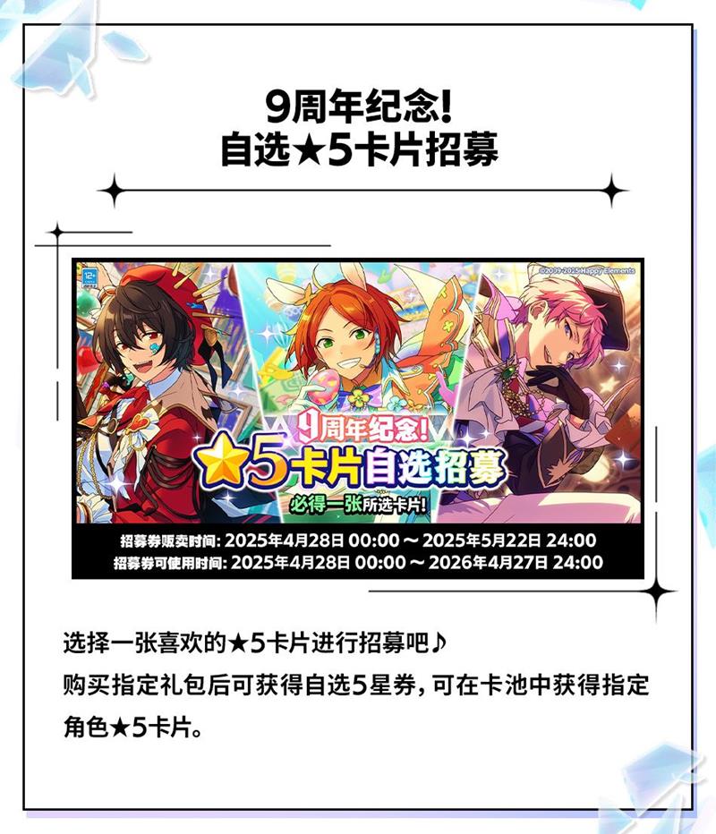 此外,《偶像梦幻祭2》还特别推出了9周年纪念招募活动。玩家在活动期间使用上级招募券招募偶像时,将有更高概率获得9周年纪念卡片,且10连招募必得两张纪念卡片。这些卡片不仅具有收藏价值,还附带了房间服装和特殊演出效果,为游戏体验增添了更多乐趣。