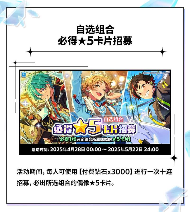 为了让玩家更轻松地获取心仪角色的五星卡片,《偶像梦幻祭2》还推出了自选五星卡片招募活动。玩家在活动期间购买指定礼包后,可获得自选五星券,从卡池中选择心仪角色的五星卡片。礼包内容丰富,包含付费钻石、自选五星券以及各类宝石等,活动期间限购一次。