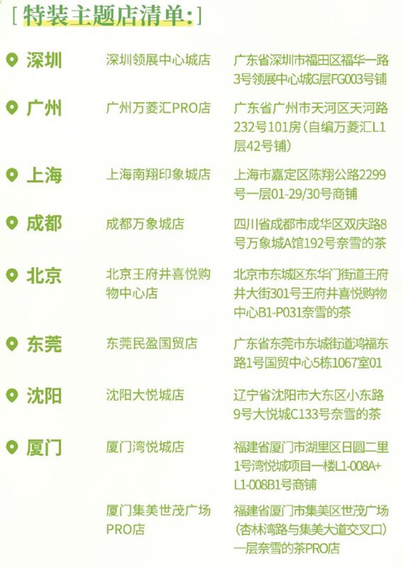 | 北京合生汇店 | 北京市朝阳区东四环中路1号合生汇B1九龙山地铁站口出奈雪的茶 | |