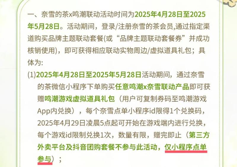 2025年4月28日至5月28日活动期间,漂泊者登录或注册奈雪的茶会员后,通过奈雪的茶微信小程序下单购买任意鸣潮×奈雪联动产品,即可获赠鸣潮游戏虚拟道具礼包。礼包包含游戏内限定头像和5000贝币。每个奈雪点单小程序账号限领一个兑换码,每个游戏账号限兑换一次。
