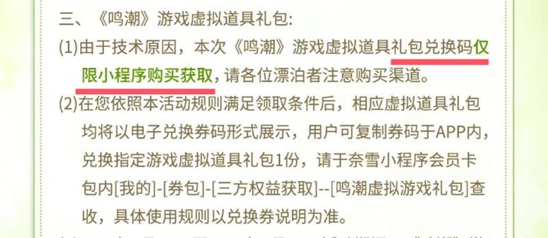兑换码将以电子券形式展示在奈雪小程序会员卡包内。漂泊者依次点击“我的”-“券包”-“三方权益获取”-“鸣潮虚拟游戏礼包”即可查收。具体使用规则以兑换券说明为准。