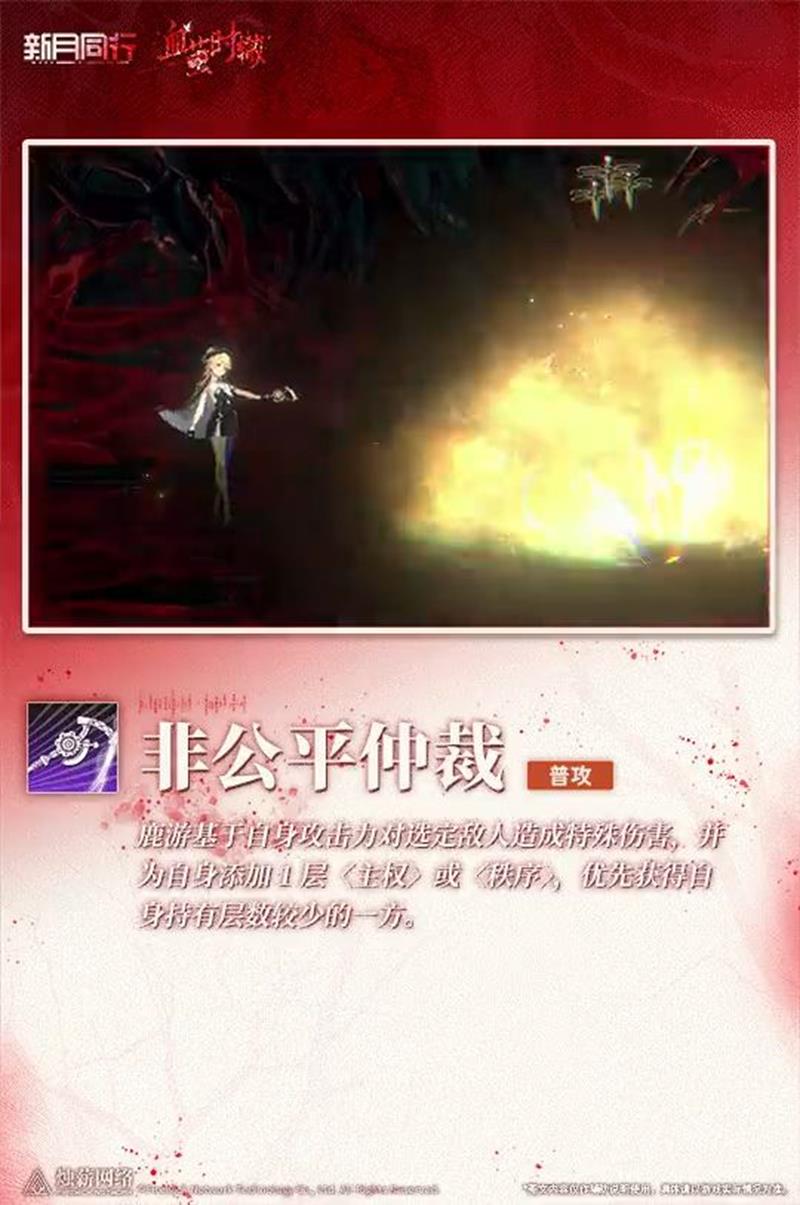 鹿游的普攻技能名为 非公平仲裁。她能基于自身攻击力对选定敌人造成特殊伤害,同时为自己添加 1 层 “主权” 或 “秩序”。这个技能的亮点在于会优先选择自身持有层数较少的那一方,从而让鹿游在战斗中能更均衡地获取两种状态层数。