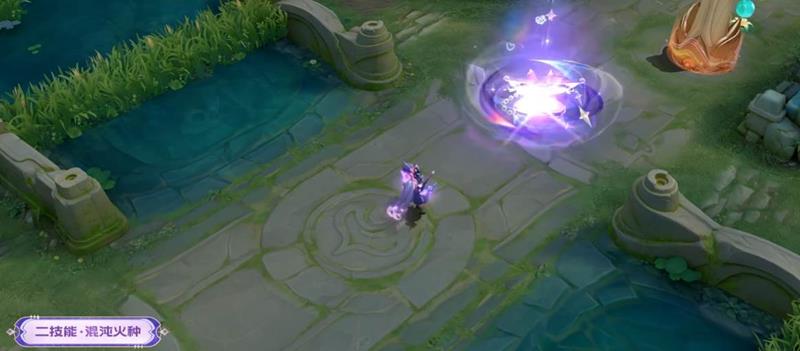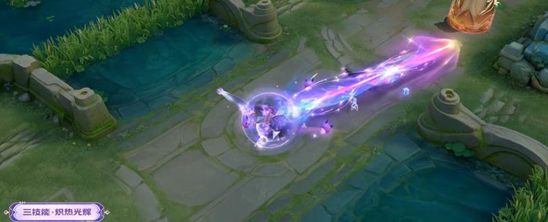 三技能:安琪拉开启魔灵钻石护盾,并释放出钻石水晶般闪亮的紫色能量光柱。三只小魔灵即使被光柱的能量裹挟转晕,也依然陪伴在侧。