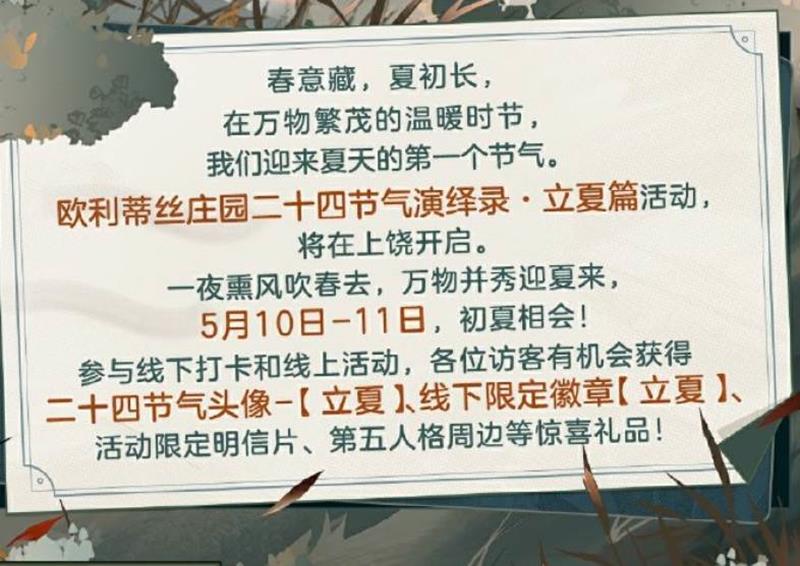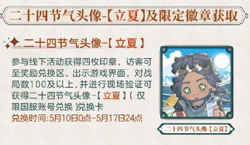 参与现场活动,各位访客有机会获得二十四节气头像-【立夏】兑换卡、线下限量徽章【立夏】、线下活动限定明信片、第五人格周边等丰富奖励~