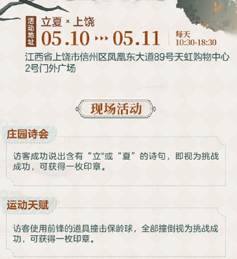第五人格立夏线下活动即将来袭!本次二十四节气演绎录——立夏篇线下活动将于2025年5月10日在江西省上饶市婺源县篁岭古村举行。活动将为玩家们带来丰富的互动体验和精美周边奖励,是一场不容错过的庄园盛会。