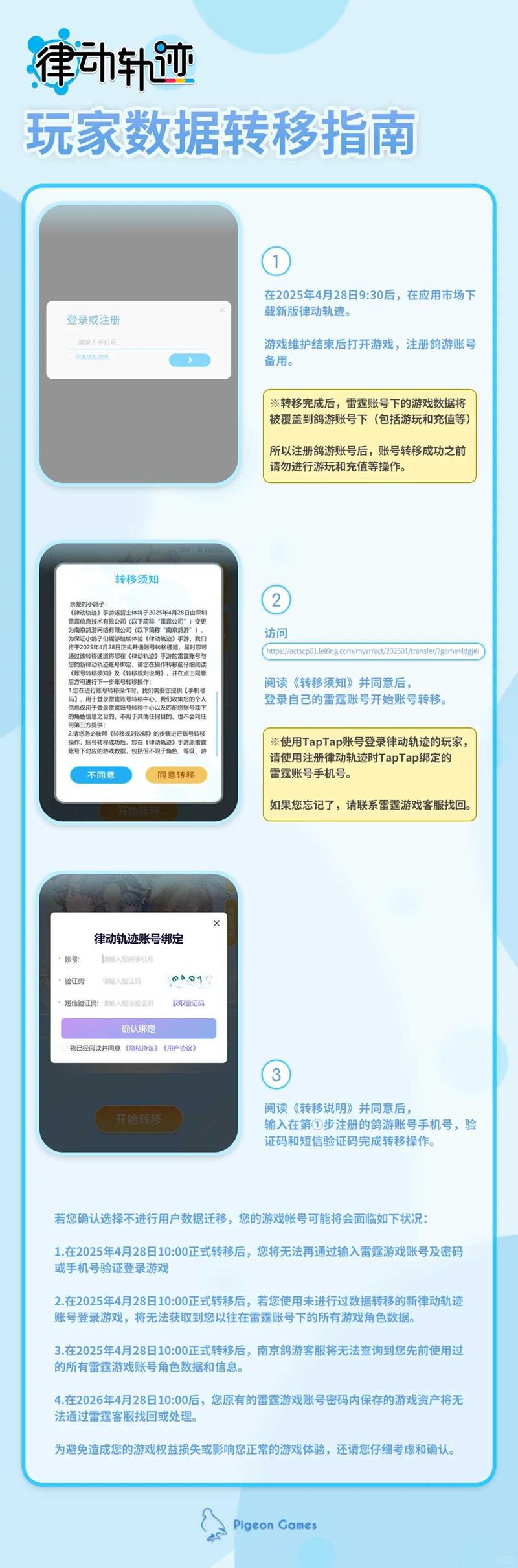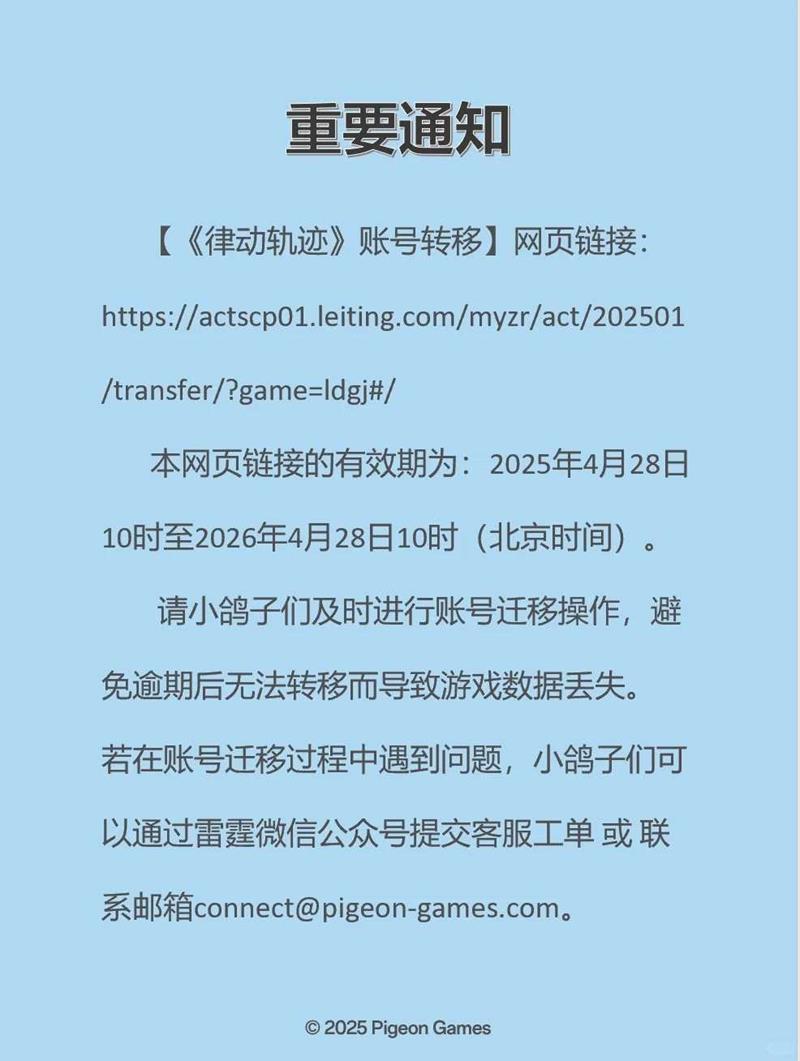 2025年4月28日9时30分,国服《律动轨迹》将进行停服维护。在维护期间,玩家需要前往应用商店更新游戏本体。更新完成后,玩家需使用鸽游账号系统注册新账号,但请注意,在完成账号数据迁移之前,切勿进入游戏或进行充值操作,否则可能会导致原有游戏进度丢失。官方特别提醒玩家,完成账号迁移后,将无法再使用雷霆账号登录游戏。