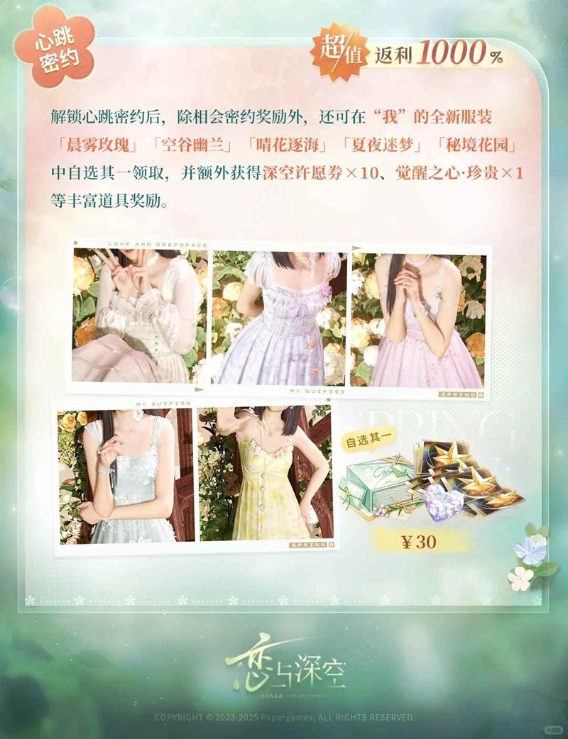 30r可额外获:自选一套主控新衣服【价值紫钻300】,10张金券,四星觉醒之心x1,以及一些杂七杂八