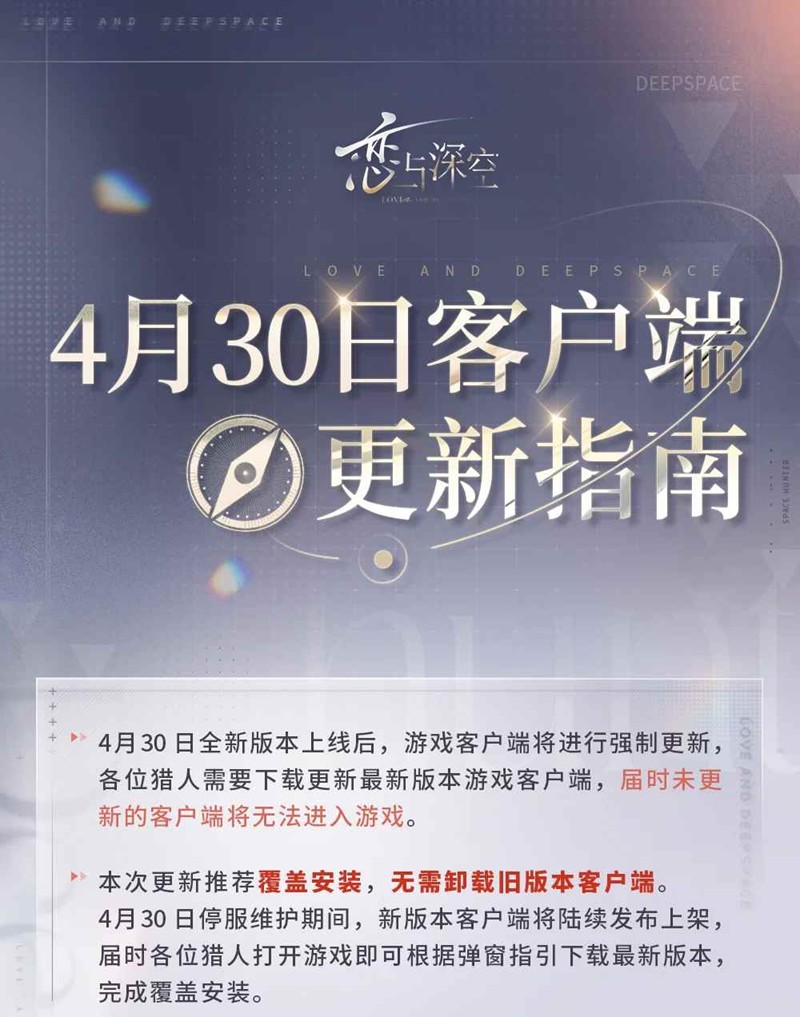 恋与深空将在明日4月30日迎来客户端强制更新,客户端更新稍微一不小心就容易对游戏账号及软件造成一定影响,那么如何安全进行客户端更新不影响之后游戏体验呢?一起来看看吧~
