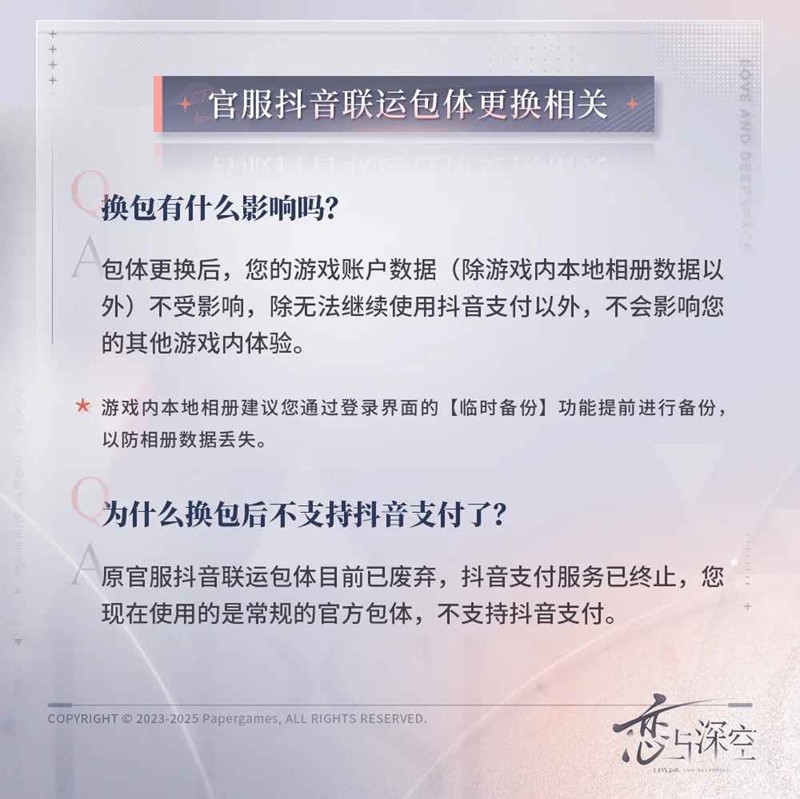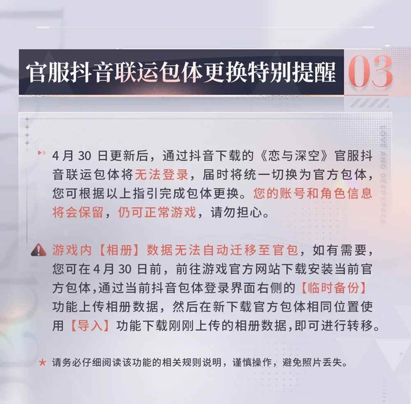 通过抖音下载的《恋与深空》官服抖音联运包体将在更新后无法登录,猎人需根据指引切换为官方包体,账号和角色信息将会保留。