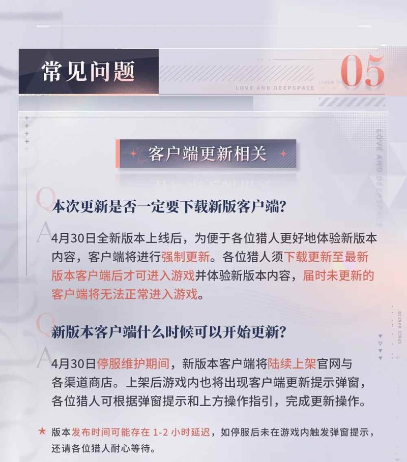 以上就是恋与深空4月30日强制客户端更新指南及常见问题的全部内容了,更多游戏资讯,攻略内容敬请关注切游网,您的支持是我们努力的动力!