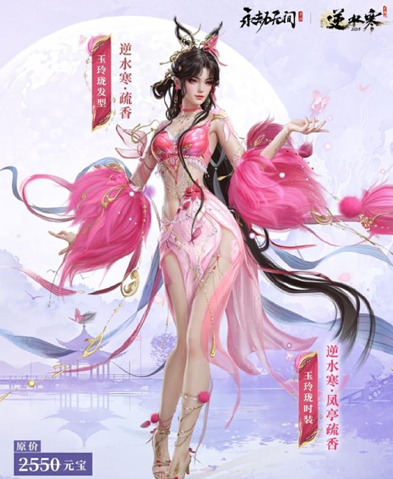 玉玲珑极品时装【逆水寒·凤亭疏香】:粉色系的时装设计宛如含苞待放的花朵,温婉而妩媚,完美还原了乱世舞姬貂蝉的形象。