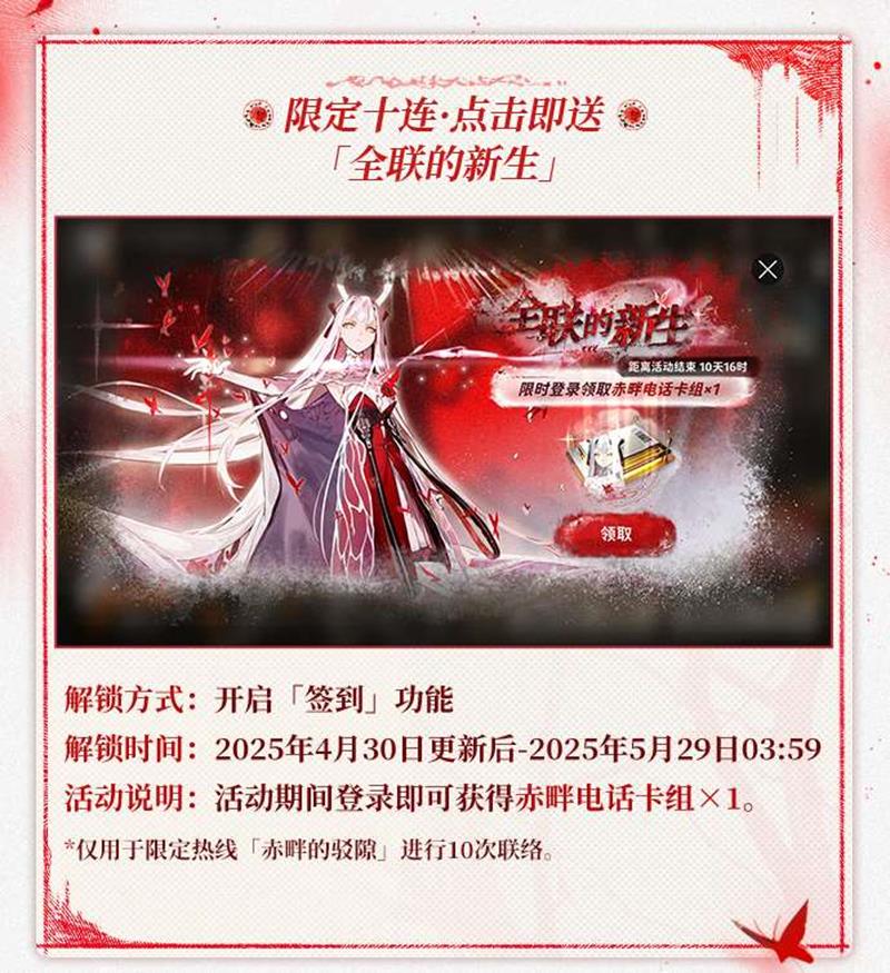 活动期间开启「签到」功能,登录即可获得赤畔电话卡组×1,仅用于限定热线「赤畔的隙」进行10次联络。解锁时间为2025年4月30日更新后至2025年5月29日3:59。