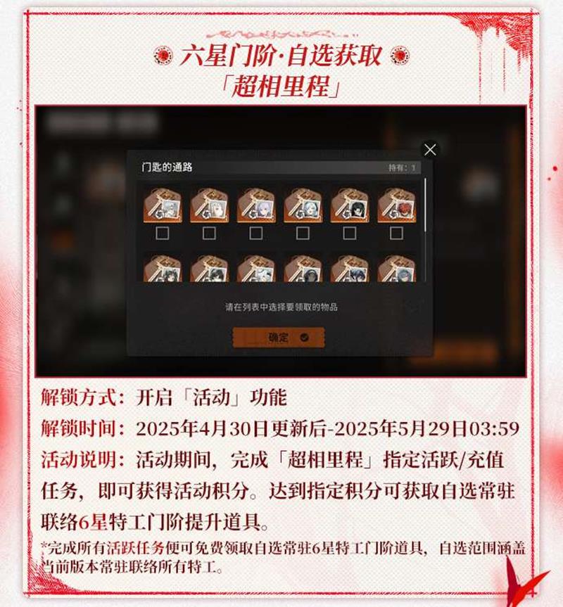 活动期间开启「活动」功能,完成「超相里程」指定活跃/充值任务,即可获得活动积分。达到指定积分可获取自选常驻联络6星特工门阶提升道具。解锁时间为2025年4月30日更新后至2025年5月29日3:59。
