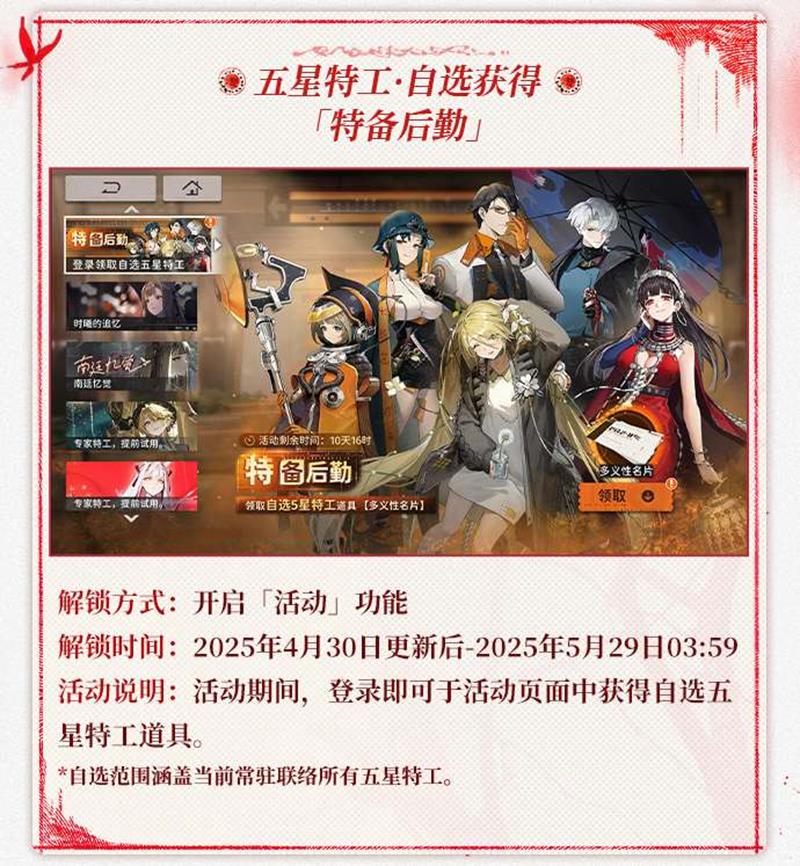 活动期间登录即可于活动页面获得自选五星特工道具。解锁方式同样是开启「活动」功能,解锁时间为2025年4月30日更新后至2025年5月29日3:59。