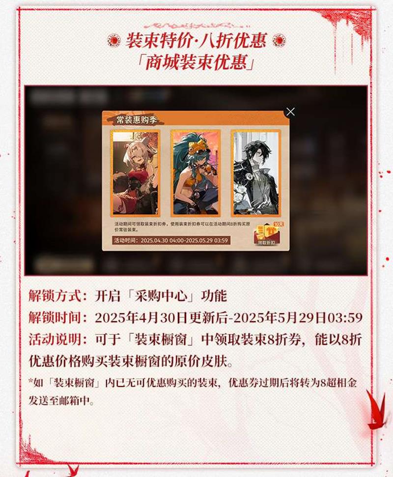 活动期间开启「采购中心」功能,可在「装束橱窗」领取装束8折券,享受8折优惠购买原价皮肤。解锁时间为2025年4月30日更新后至2025年5月29日3:59。