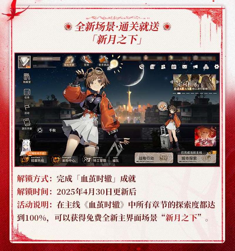 完成「血茧时辙」成就,即主线《血茧时辙》所有章节探索度达到100%,可获得全新主界面场景「新月之下」。解锁时间为2025年4月30日更新后。