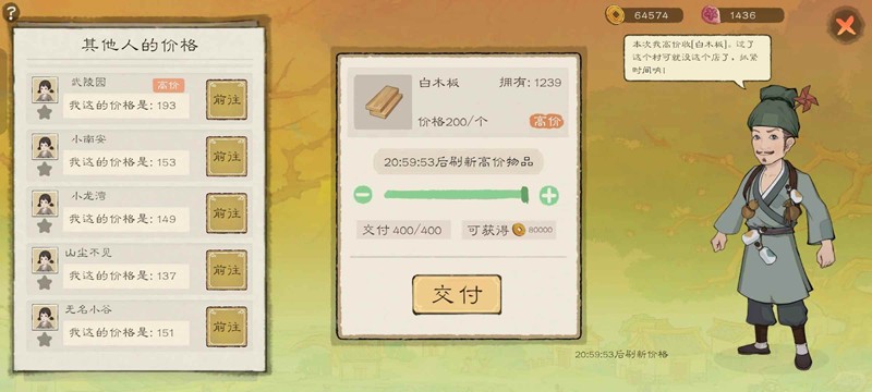 谷主规模达到9级后解锁,在桃谷右下角建立夜市。每天(现实时间)随机刷新某种材料,不同谷主价格不同,建议去其他谷主那里高价售卖,不论什么材料,最高可获得8万铜钱,如图④所示。