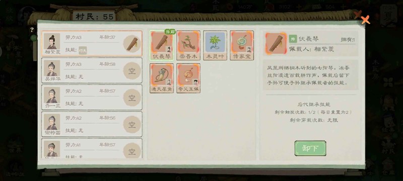 如果现实世界每天玩本游戏时间小于游戏内20天,那么无需考虑宝物使用,直接将伏羲琴给学习了红色技能村民佩戴即可,若红技村民为男性,则在此男性结婚后,给其妻子佩戴崇吾木,一次性生俩遗传了红技的村民。若红技村民为女性,则崇吾木无需佩戴,给此村民佩戴伏羲琴即可,因为伏羲琴不分男女,崇吾木限定女性,伏羲琴每天可以生效两次,若俩宝物同时触发,伏羲琴一次就结束了,因为遗传了俩娃。