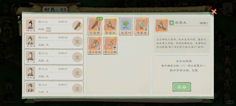 一个女性村民一生最多生二娃,人口超过不死树庇护上限时,最多一娃,但崇吾木可以强制生二娃双胞胎,不受不死树限制。