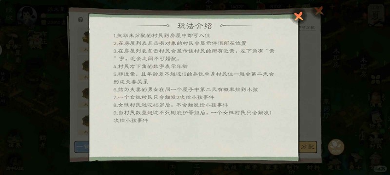 满足条件的男女村民在关闭自动婚配后,手动丢到同一件房屋内,游戏时间下一天自动结为夫妻,再下一天开始有概率生娃。