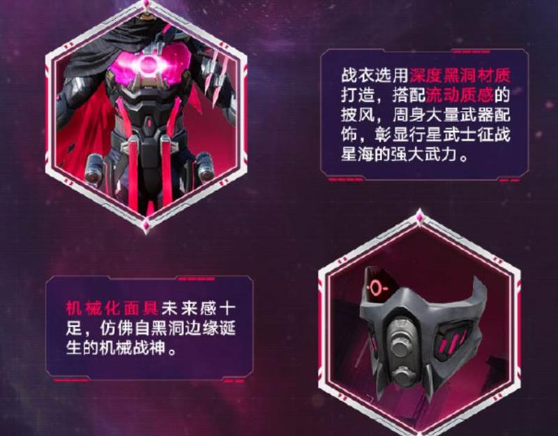 以神秘的宇宙黑洞边缘为设计灵感,塑造冷峻强大的行星武士形象,犹如置身于危险的星际战场。