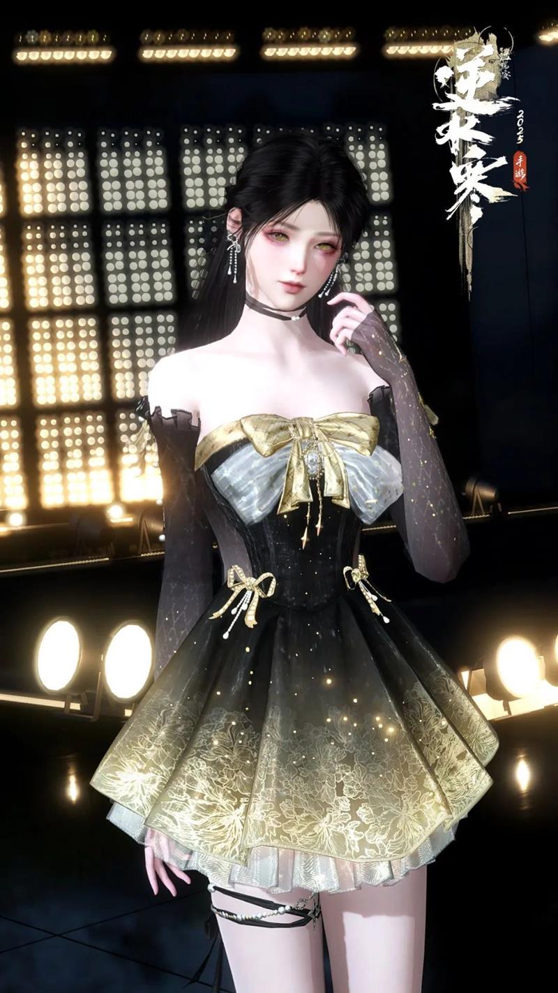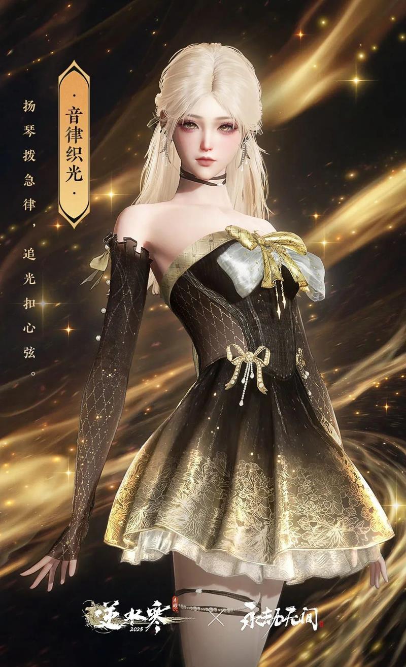 季莹莹同款时装【音律织光】:这款时装以音律为主题,整体设计充满了灵动与优雅,浅金色的长发扎成公主头,搭配背后的黑色蝴蝶结,尽显高贵气质。