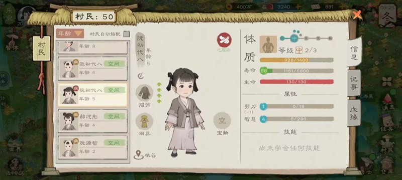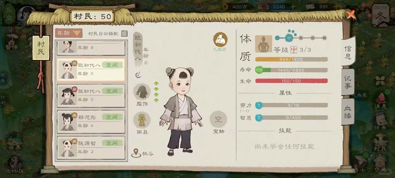 4.村民生育年龄:村民18岁可结婚,要晚生晚孕(尽量提高父方母方寿命),如男女生下来都是基础62寿命,到了25岁突破了63寿命,再去婚配那么下一代会是63寿命,一代人只能拔高一寿命,寿命突破后立马拉去生育下一代,住一起后过两年才结婚,结婚后过两年才生小孩,当你规划好的男女离突破寿命还有3,4天的时候就可以手动去分配其住在一个房子了。若是村民无法突破寿命等级或没有合适对象,让他单身一辈子。