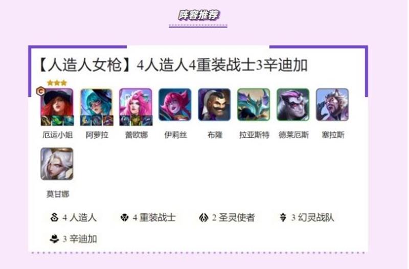 这套阵容在S14赛季有着不错的强度,核心是女枪搭配人造人羁绊,能打出高额群体伤害。