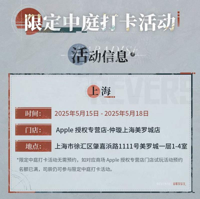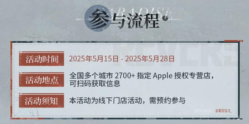 活动将在 2025 年 5 月 15 日至 5 月 28 日期间举行,遍布全国多个城市,涵盖 2700 多家指定的 Apple 授权专营店。玩家可以扫描活动专属的二维码,查看距离自己最近的门店,并选择合适的时间进行预约。预约成功后,玩家需按照预约时间前往指定门店签到,参与活动。值得一提的是,本次活动采取预约制,只有提前预约成功的玩家才能享受活动的精彩内容和丰厚奖品。