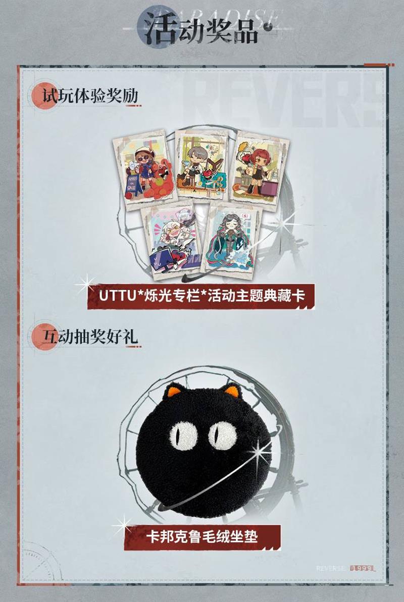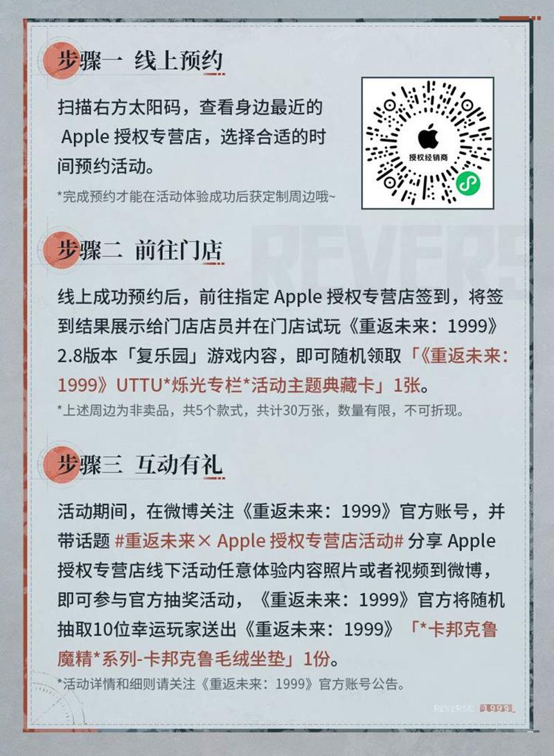 活动期间,玩家将有机会体验《重返未来:1999》的 2.8 版本“复乐园”的游戏内容。完成签到和游戏试玩后,玩家可随机领取《重返未来:1999》UTTU烁光专栏活动主题典藏卡一张。这些典藏卡共有 5 个款式,总量达 30 万张,但数量有限,先到先得。此外,玩家还可以在微博上关注《重返未来:1999》的官方账号,并带话题 #重返未来 X Apple 授权专营店活动# 分享在门店的活动体验照片或视频,参与官方的抽奖活动。幸运玩家将有机会获得《重返未来:1999》卡邦克鲁魔精*系列——卡邦克鲁毛绒坐垫一份。